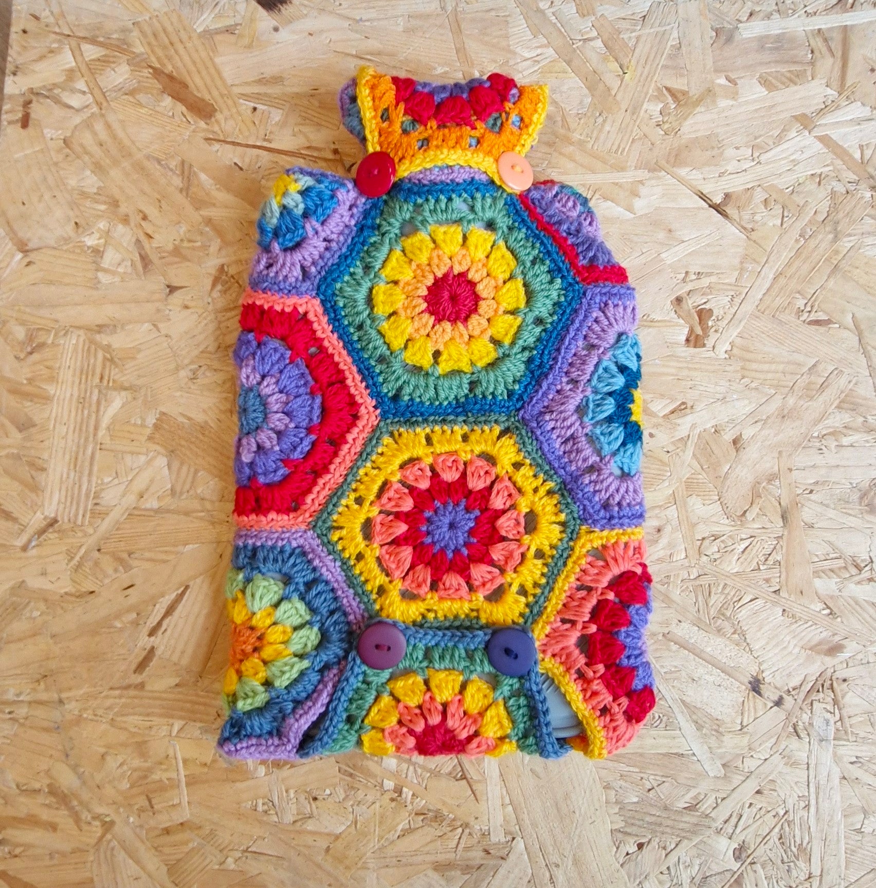 Handmade Crochet Hot Water Bottle Cover. Stay warm and colourful with a unique handmade gift from Leeds. This complete set includes the hot water bottle and a vibrant, artisan crocheted cover, expertly crafted by Leeds-based crochet artist Celia Smith. Perfect for cozy nights and adding a pop of colour to any home."